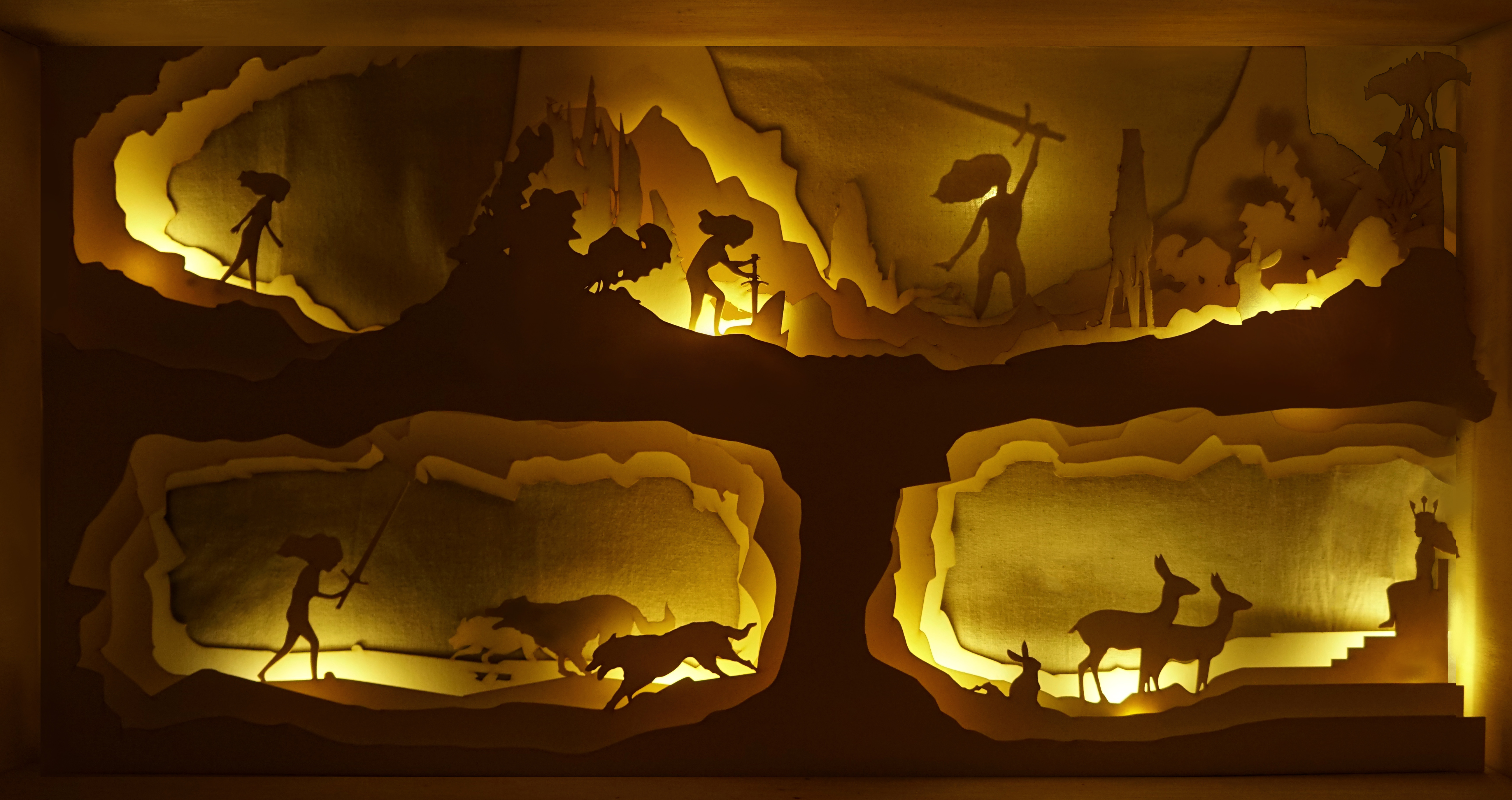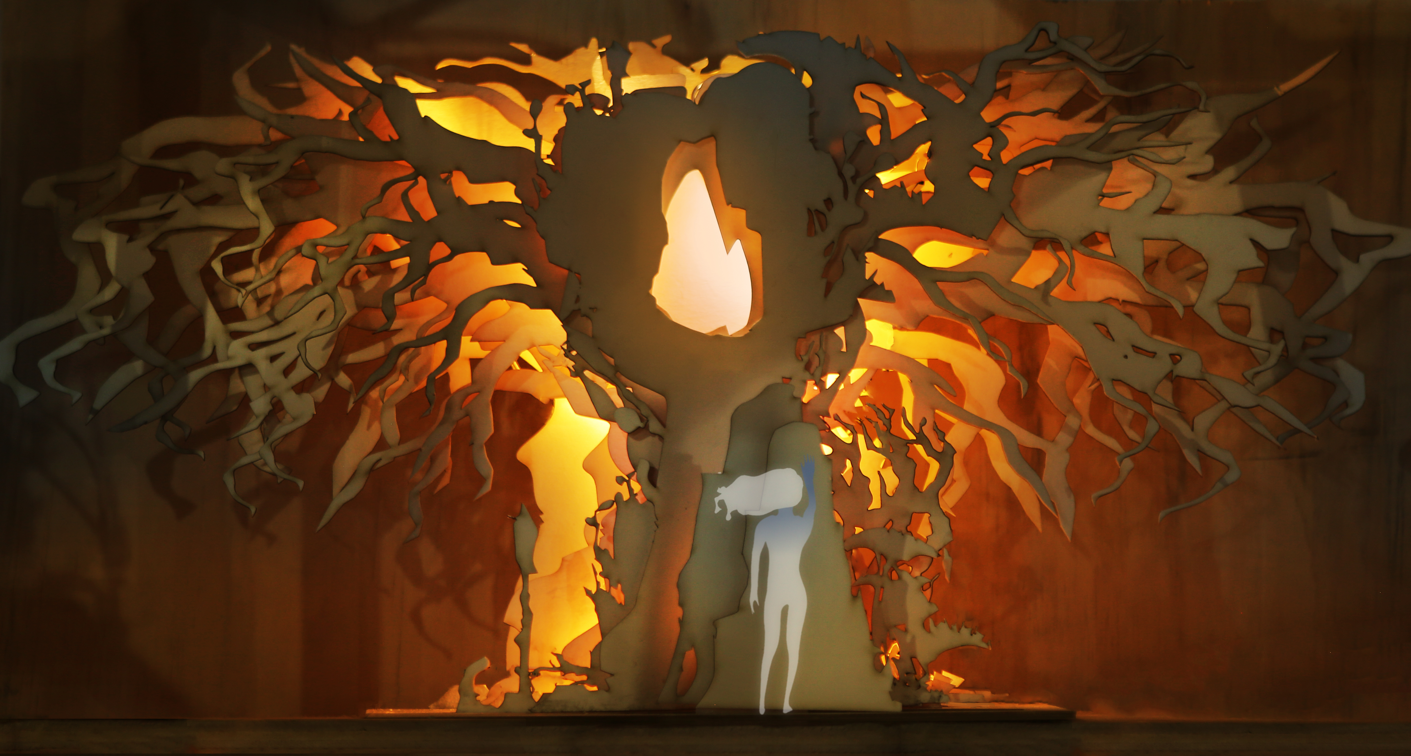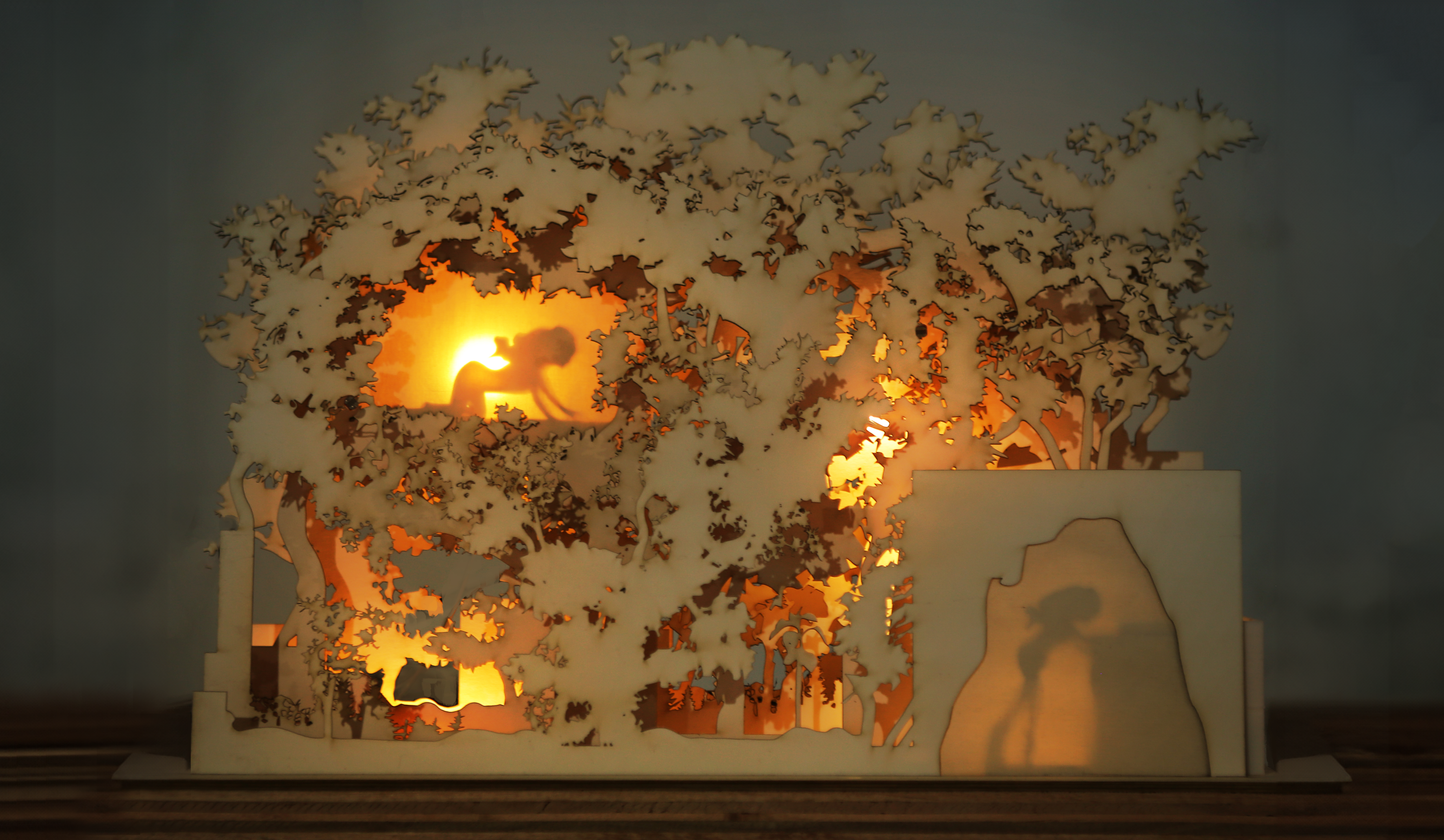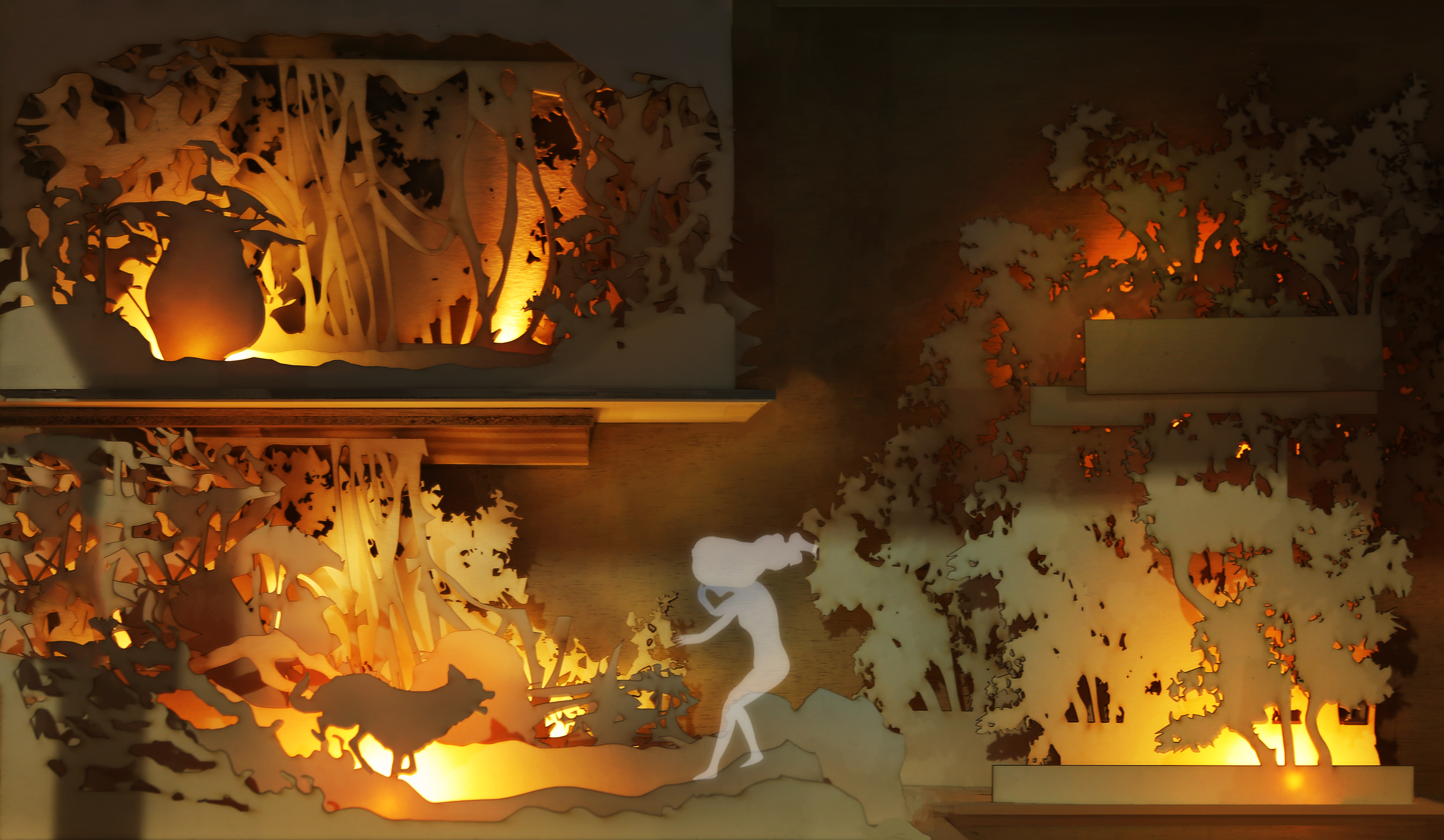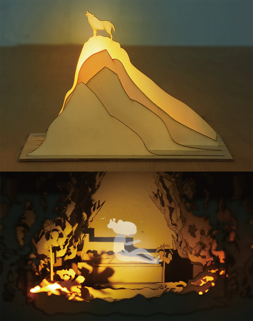 In the beginning, I wanted to change the definition of video game devices——screens and controllers. I was thinking how I could remove those two things and design a new device for a scroll game. I built real scenes to replace screens and asked players to use hands instead of controllers. The character will be projected on the scenes. When she gets into trouble, users have to “give her a hand”. I applied mixed reality techniques to combine holographic projections and paper models. With this game, I wanted to create an alternative multimedia game presentation method and a new way for viewers to become involv ed in a work. For example, she can jump on users' hands to climb up, use flashlight to light up her way, or touch the trigger by hand. The character will show her feeling and interact with the users.